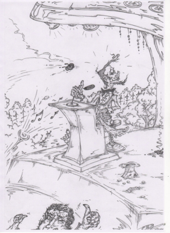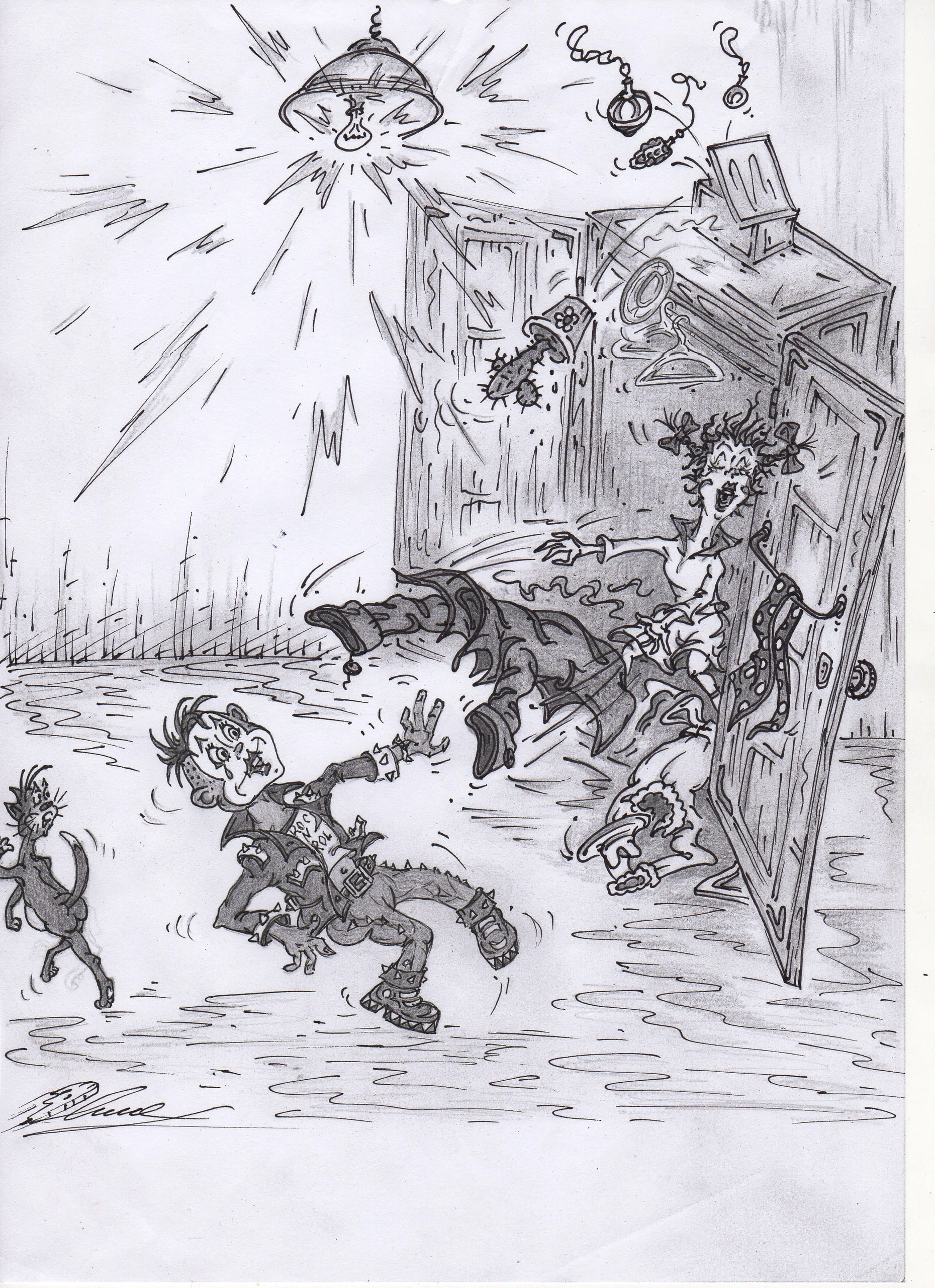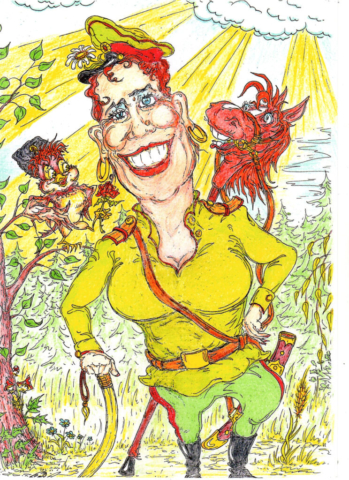 - Карикатуры и фантазия: Гротескные фигуры, такие как воинственная женщина с петухом на плече, поющий демон на сцене или индейский воин в городском пейзаже, полные иронии и сатиры.