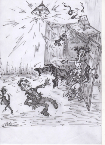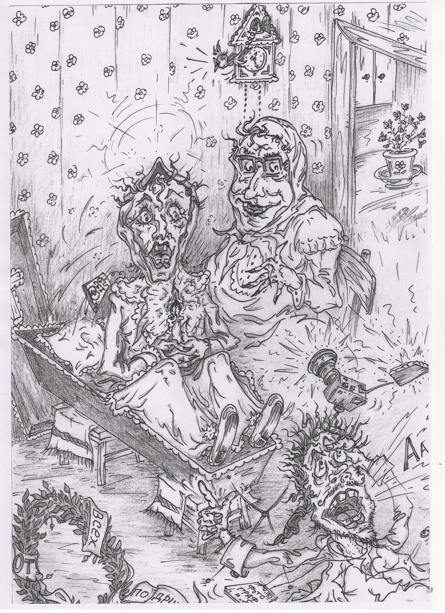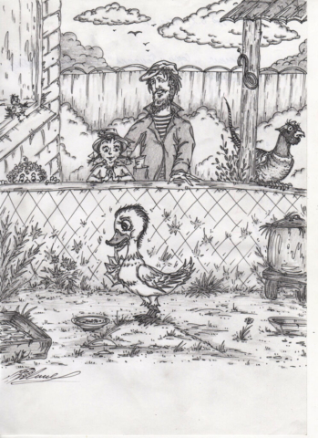 - Бытовые иллюстрации: Семейные моменты, как бабушка с ребенком в комнате или утка в дворе с людьми за забором, добавляющие тепла и юмора.