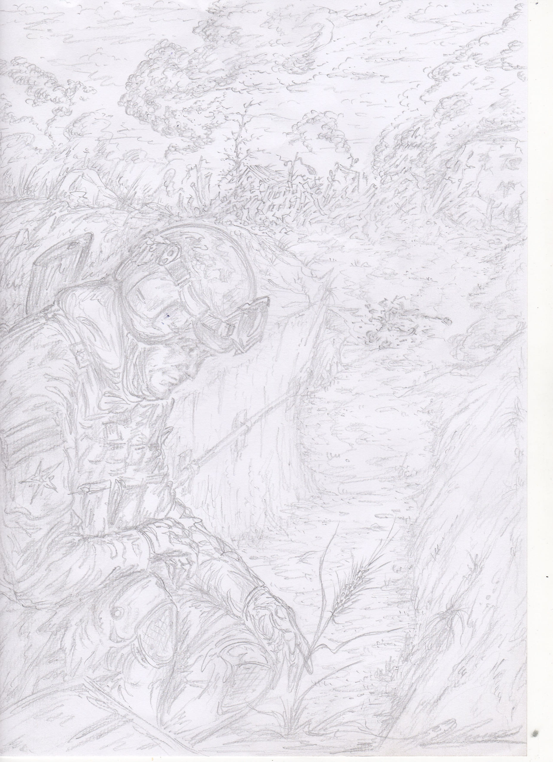 - Военные мотивы: Солдат в поле, задумчиво держащий колосок, символизирующий контраст между разрушением и жизнью.